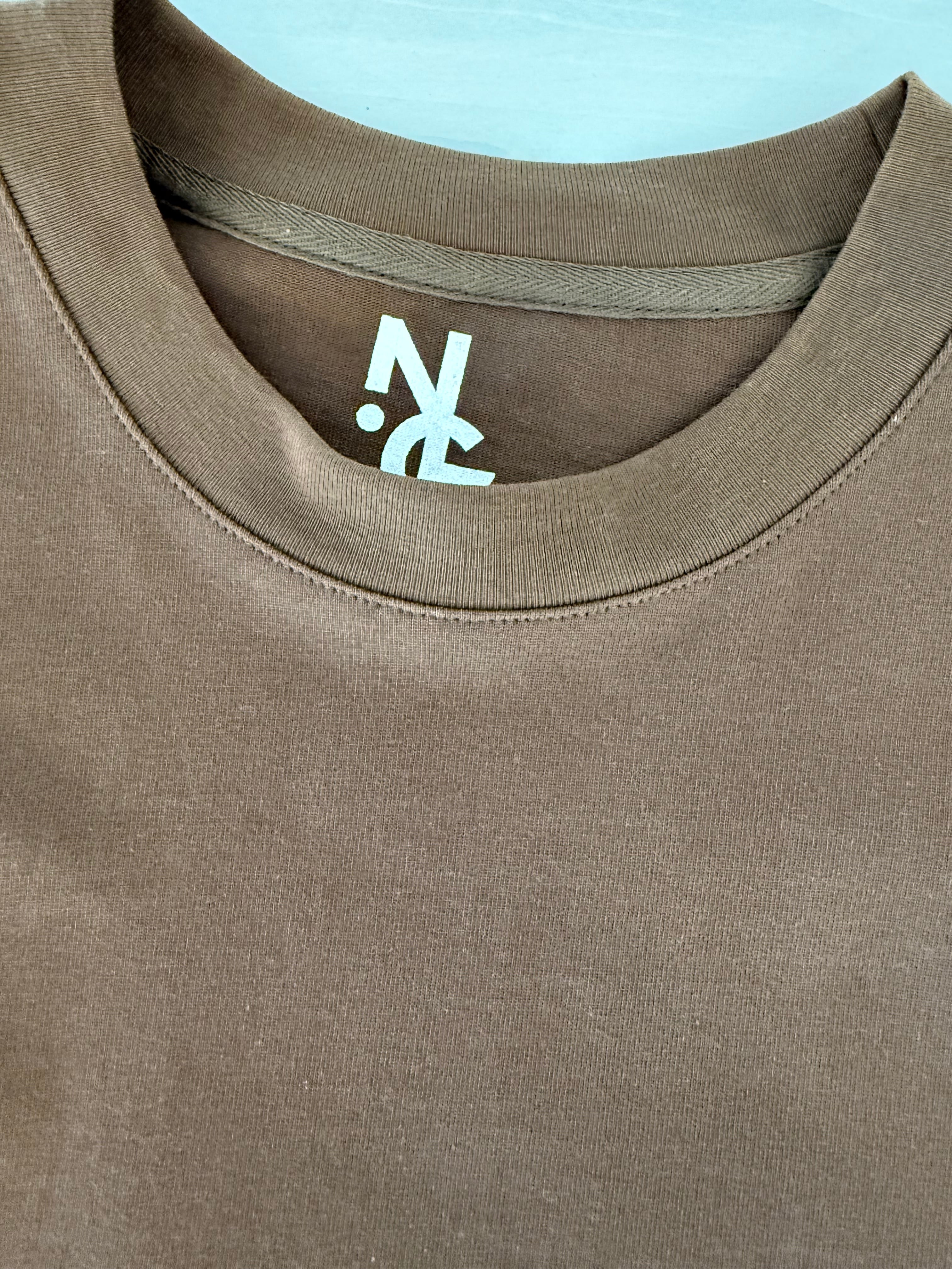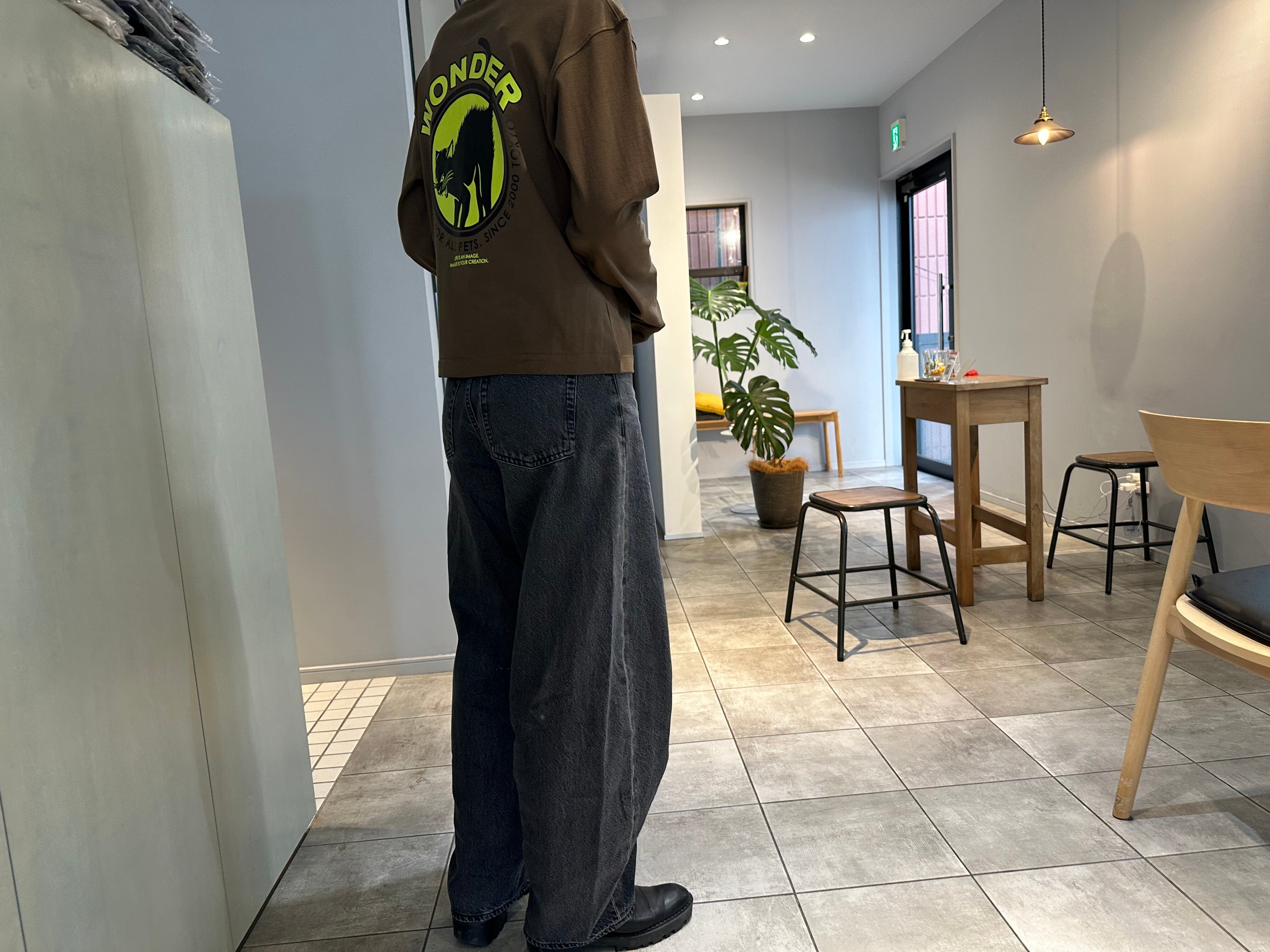 着丈短め・身幅広め・袖長め・ネックは詰まり気味のBOXシルエット。ワンオッシュかかってます。
