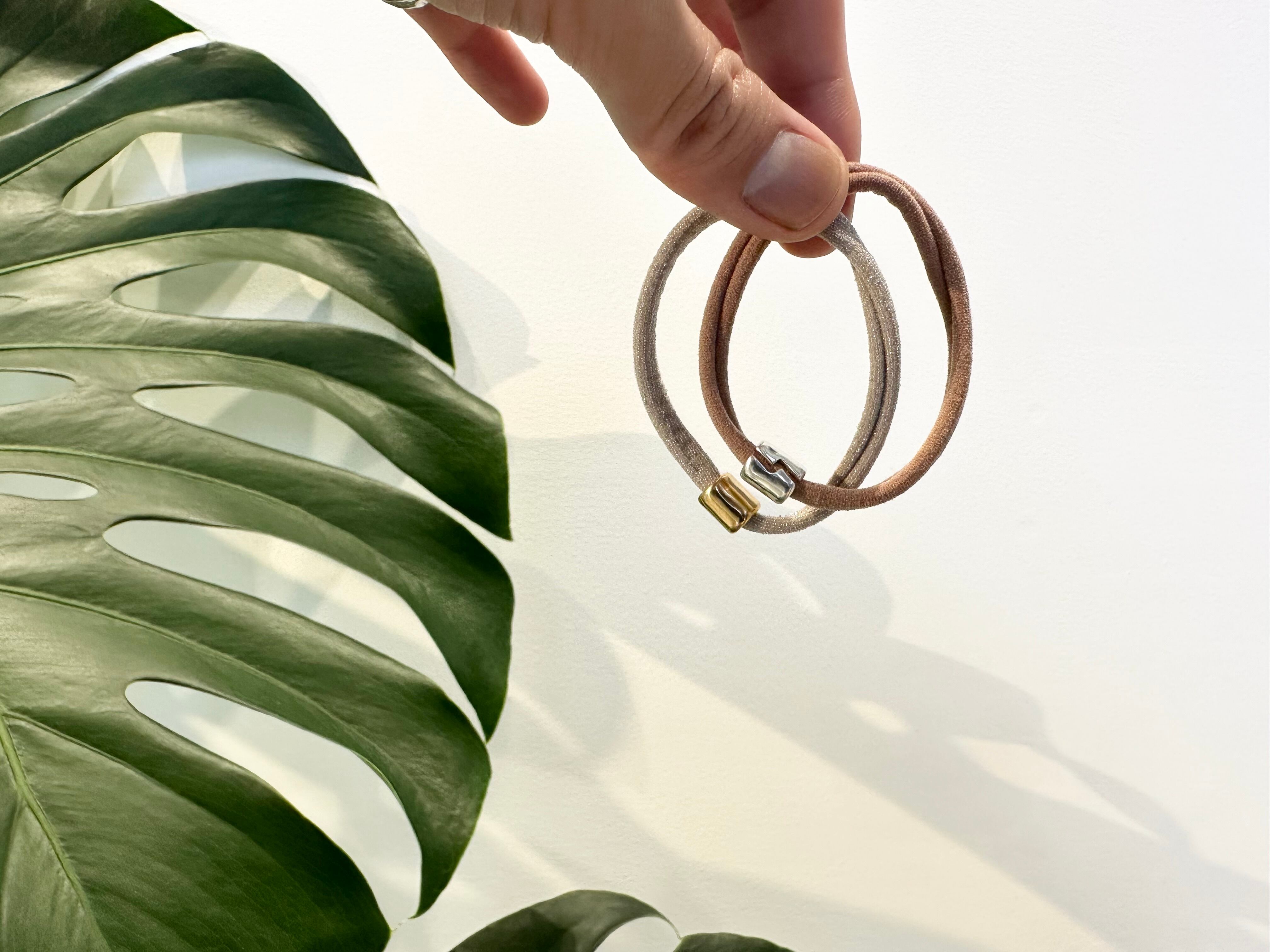ヘアゴムの色で雰囲気も変わりますし、細いヘアゴムを二重に通すのもおすすめです。自分好みにカスタムしてお使い下さい。